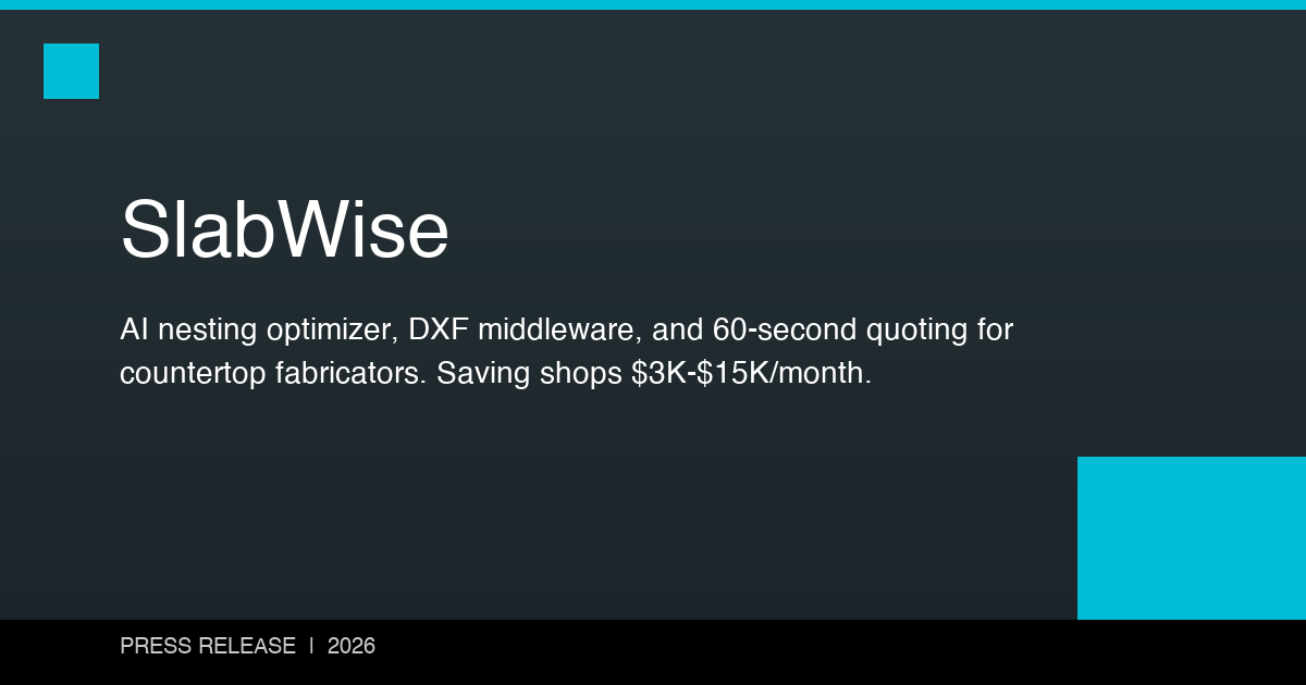SlabWise is an AI-powered countertop fabrication platform designed to help stone fabrication businesses optimize slab usage, automate quoting workflows, and streamline file conversion between templating and CNC systems. By combining nesting optimization, inventory tracking, and automated estimation tools, the platform helps fabrication shops reduce waste and improve operational efficiency. Learn more at https://slabwise.com.